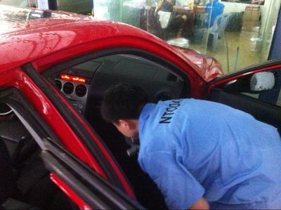 在全部工作開(kāi)始前,工作人員用塑料薄膜將方向盤(pán)和儀表臺(tái)全部包好,防止因噴灑液體而損壞電器元件。