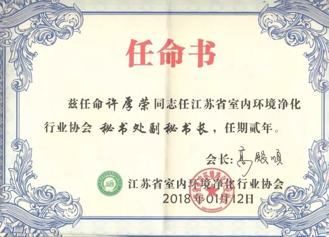 2018年1月13日,“中國室內(nèi)環(huán)境凈化行業(yè)協(xié)會聯(lián)盟”與“江蘇省室內(nèi)環(huán)境凈化行業(yè)協(xié)會”聯(lián)合舉辦的首屆“中國室內(nèi)環(huán)保行業(yè)創(chuàng)新創(chuàng)優(yōu)、融合發(fā)展”高峰技術(shù)年會在中國南京召開。協(xié)會隆重表彰了2017年度行業(yè)“突出貢獻(xiàn)獎”——許厚榮,任命其為江蘇省室內(nèi)環(huán)境凈化行業(yè)協(xié)會秘書處副秘書長。