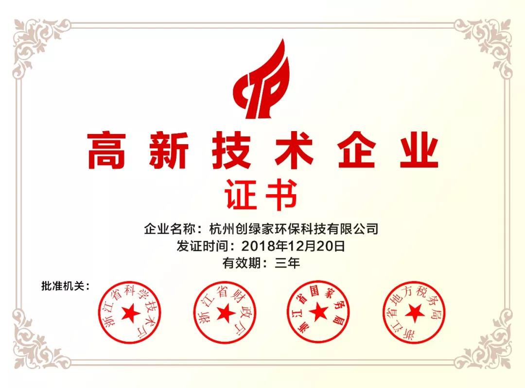 2018年12月,杭州創(chuàng)綠家環(huán)保科技有限公司被認(rèn)定為國家高新技術(shù)企業(yè)。