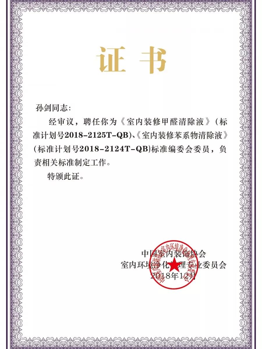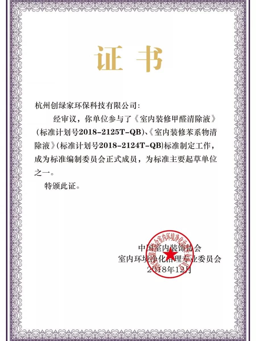 2018年12月19日,中國室內(nèi)環(huán)境凈化治理行業(yè)第五屆技術(shù)創(chuàng)新分享會在北京新聞大廈長安發(fā)布廳舉行。創(chuàng)綠家環(huán)保成為《室內(nèi)裝修甲醛清除液》、《室內(nèi)裝修苯系物清除液》標(biāo)準(zhǔn)內(nèi)編制委員會正式成員,為標(biāo)準(zhǔn)主要起草單位之一,創(chuàng)綠家環(huán)??偛脤O劍被聘任為該標(biāo)準(zhǔn)編委會委員。
