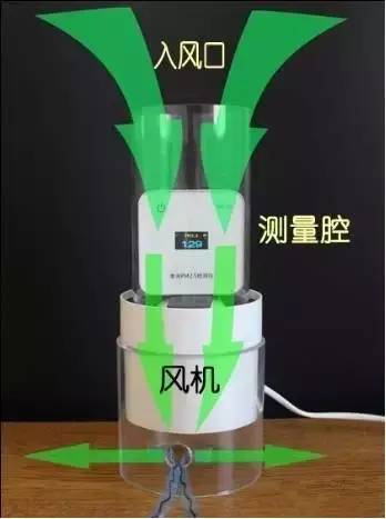 通電后,風(fēng)機轉(zhuǎn)動時帶動氣體向下流動,將口罩套在入風(fēng)口,在風(fēng)機的作用下,氣體透過口罩從入風(fēng)口進入測量腔中,分別測量通電前PM2.5濃度和口罩過濾后的PM2.5濃度。