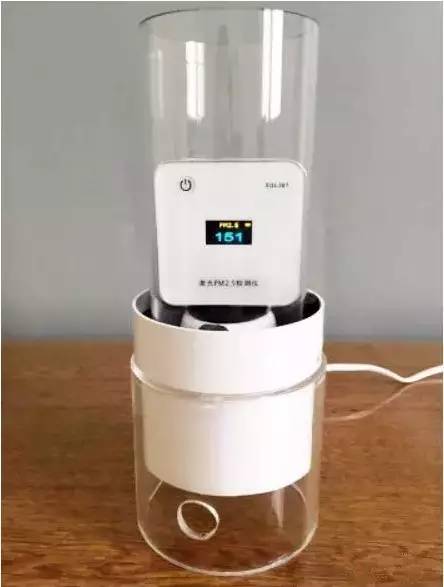 在一個約30平方米的密閉房間內(nèi),點燃香煙,模擬PM2.5高濃度環(huán)境。測得室內(nèi)PM2.5原始值為50μg/m3,點燃1支香煙,室內(nèi)PM2.5數(shù)值升至151μg/m3;將6款口罩用橡皮筋依次罩到風(fēng)機口上,30秒后觀察PM2.5數(shù)值變化情況。